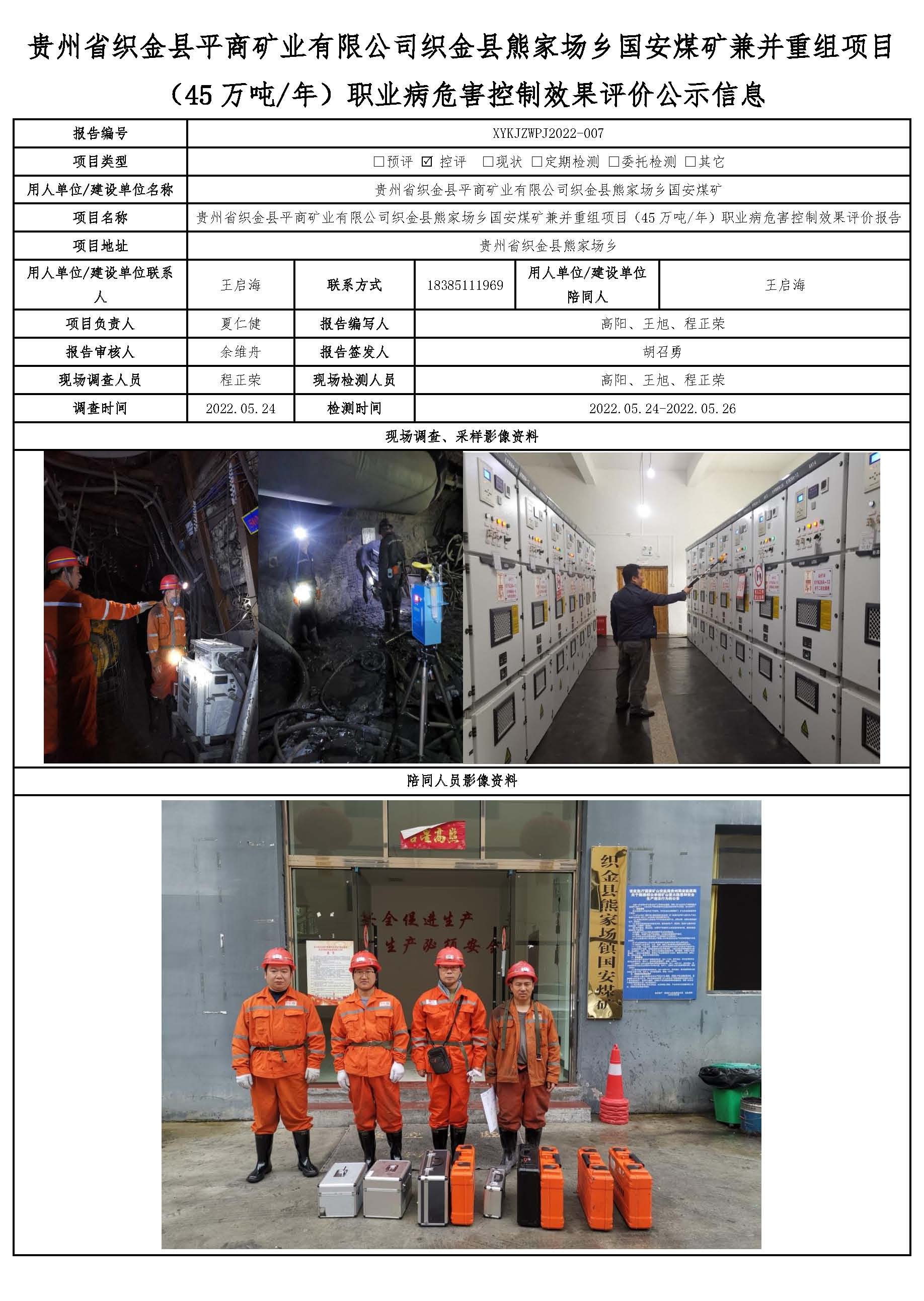 貴州省織金縣平商礦業有限公司織金縣熊家場鄉國安煤礦兼并重組項目職業病危害控制效果評價公示信息