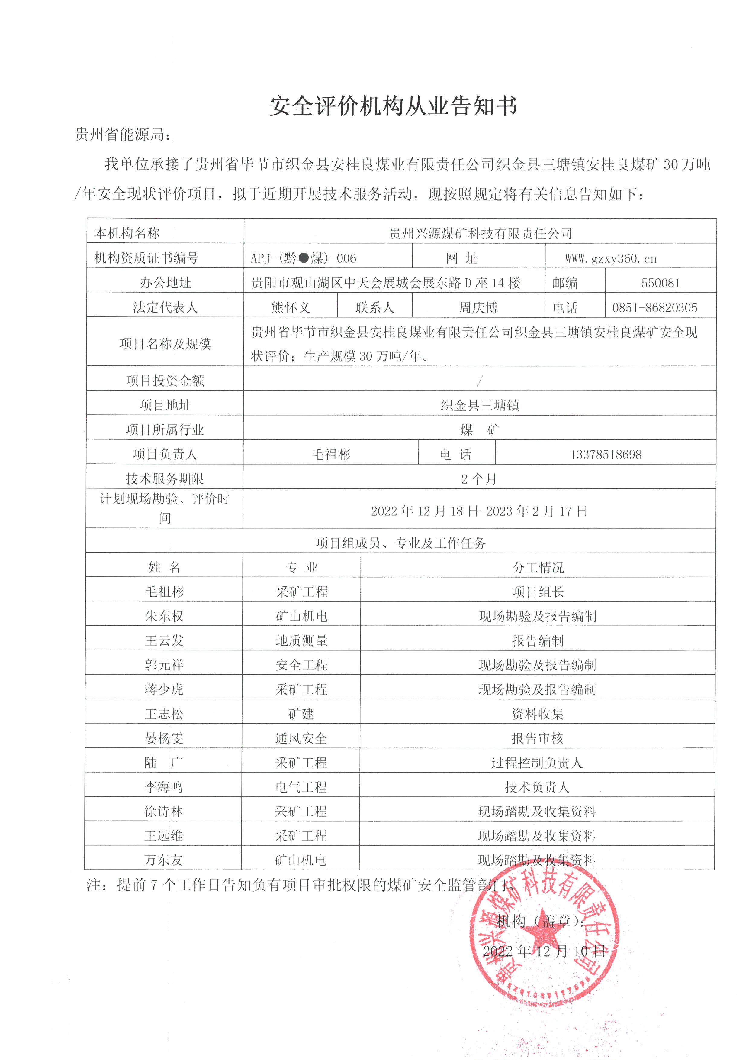安全評價機(jī)構(gòu)從業(yè)告知書【貴州省畢節(jié)市織金縣安桂良煤業(yè)有限責(zé)任公司織金縣三塘鎮(zhèn)安桂良煤礦】