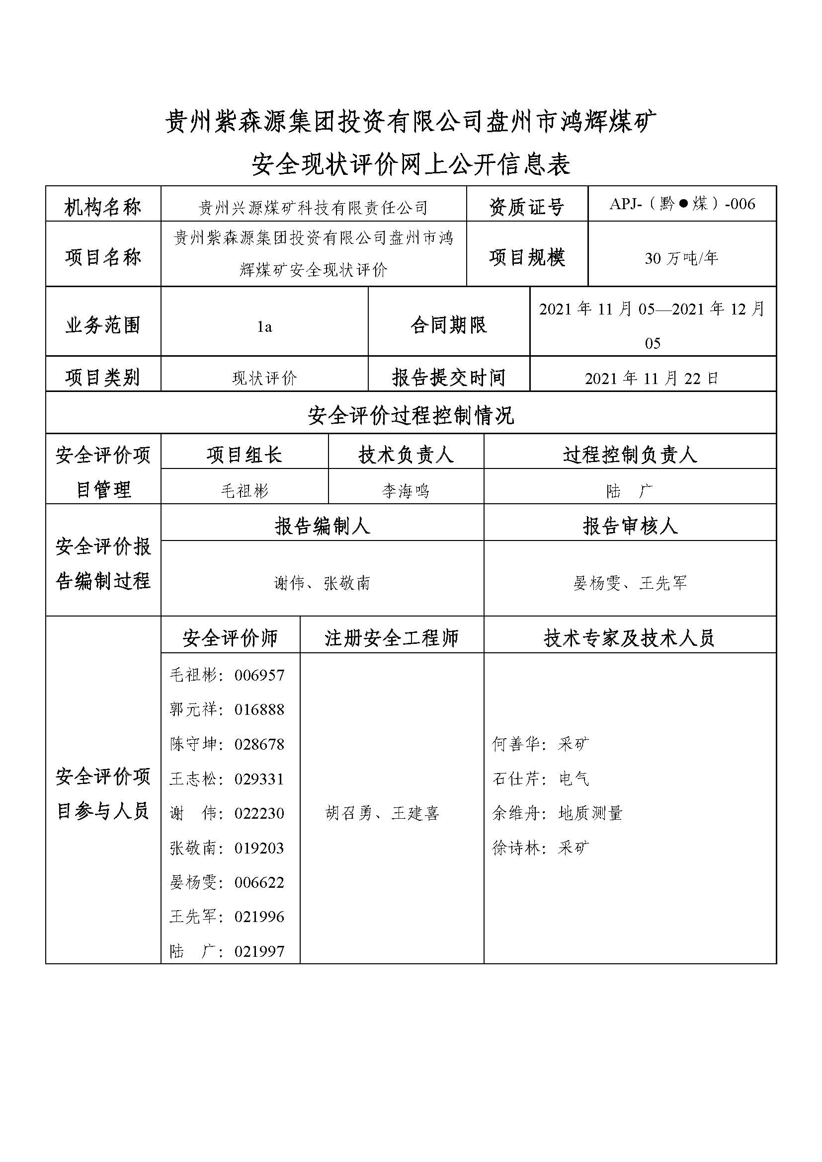 貴州紫森源集團(tuán)投資有限公司盤州市鴻輝煤礦 安全現(xiàn)狀評(píng)價(jià)網(wǎng)上公開信息表