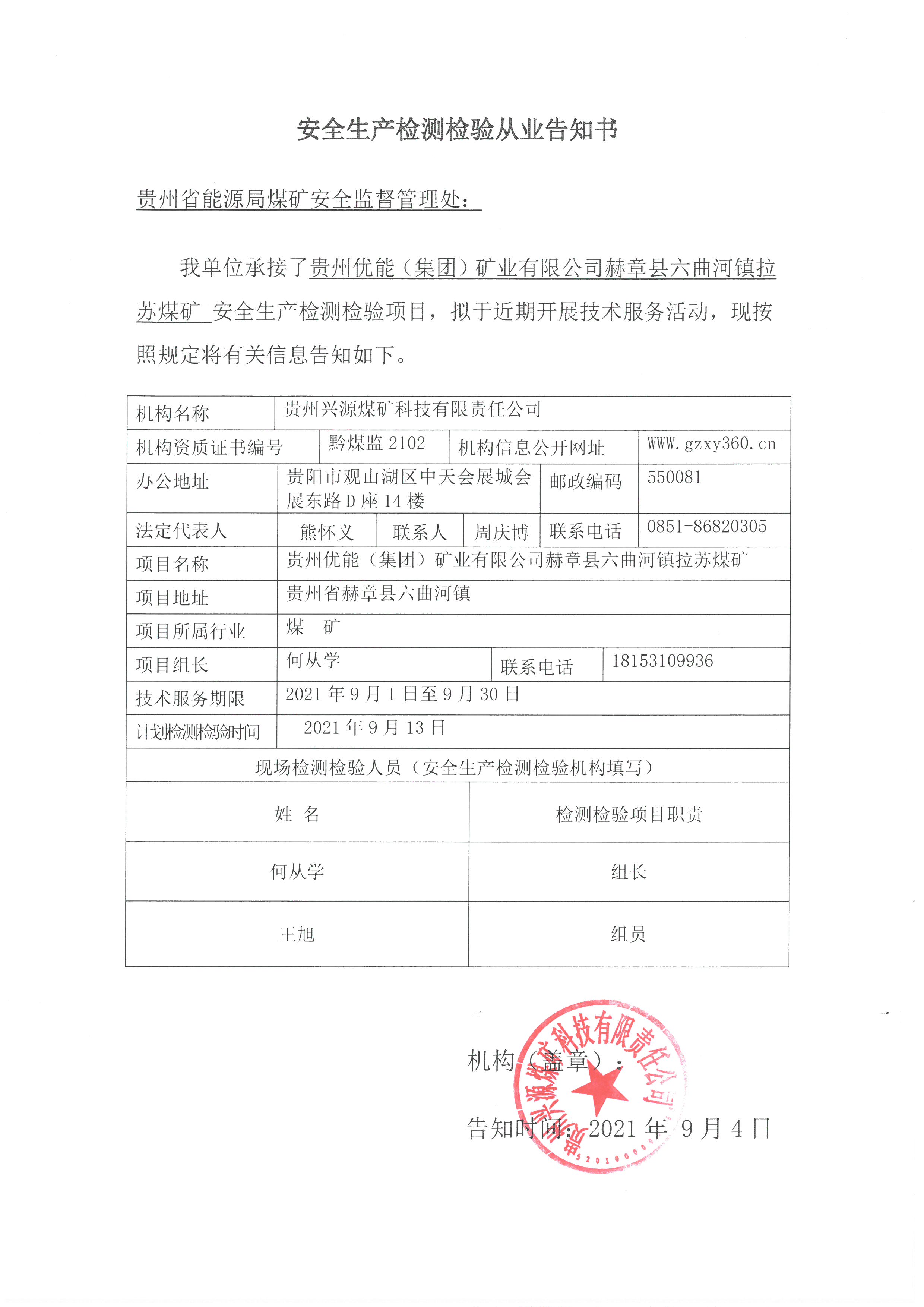 安全生產(chǎn)檢測檢驗從業(yè)告知書【貴州優(yōu)能(集團)礦業(yè)有限公司赫章縣六曲河鎮(zhèn)拉蘇煤礦】