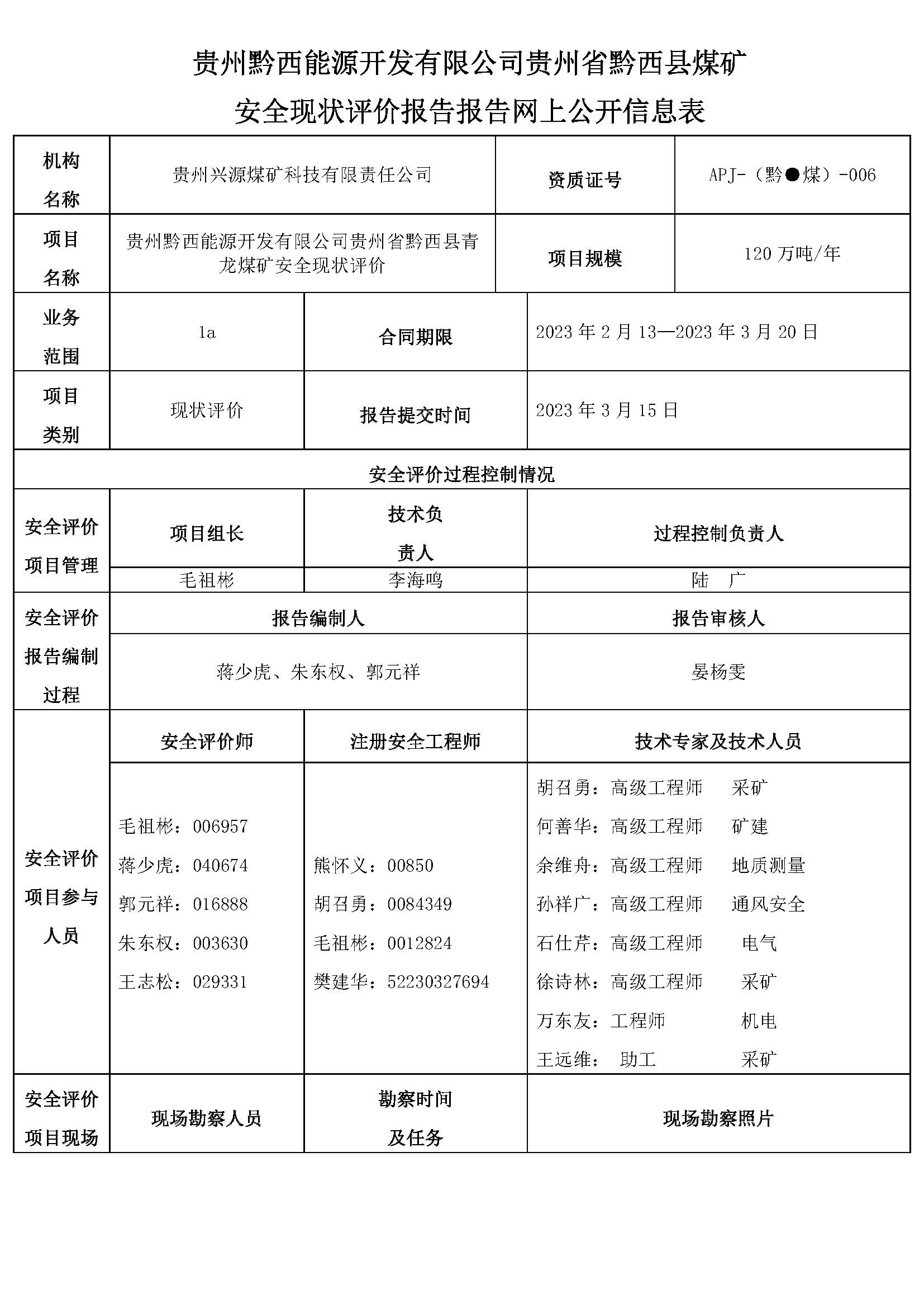 貴州黔西能源開發有限公司貴州省黔西縣煤礦安全現狀評價報告報告網上公開信息表
