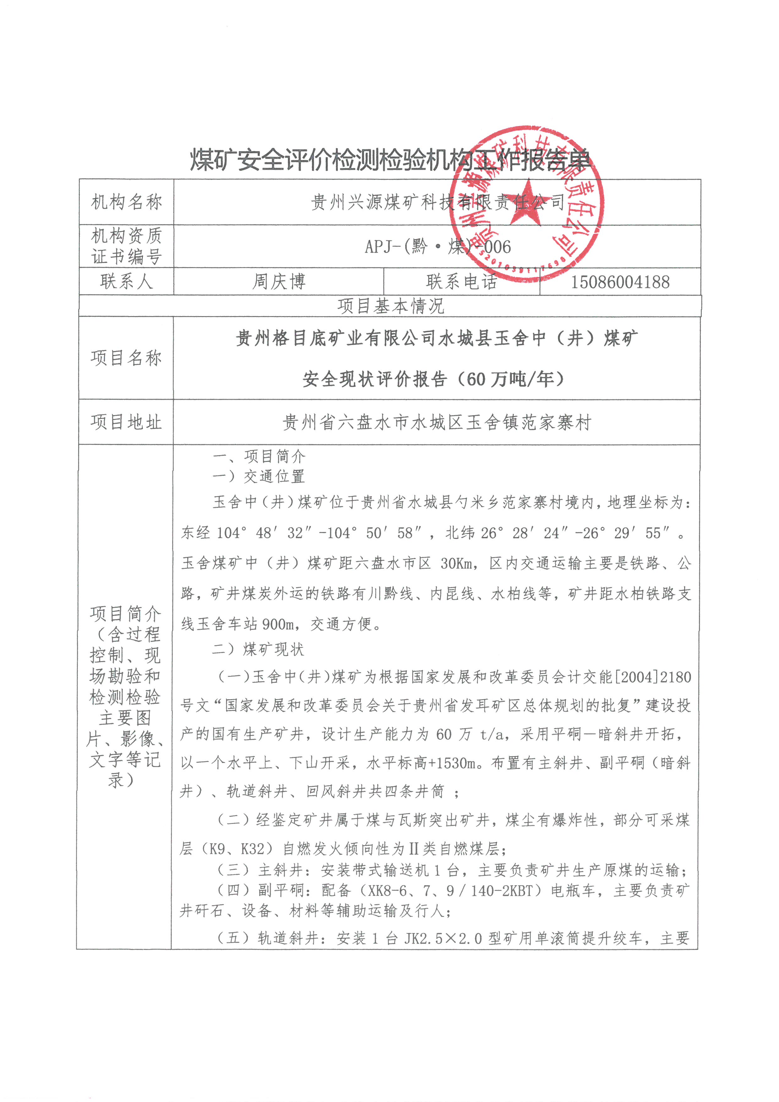 煤礦安全評(píng)價(jià)檢測(cè)檢驗(yàn)機(jī)構(gòu)工作報(bào)告單【貴州格目底礦業(yè)有限公司水城縣玉舍中(井)煤礦 安全現(xiàn)狀評(píng)價(jià)報(bào)告(60萬噸/年)】