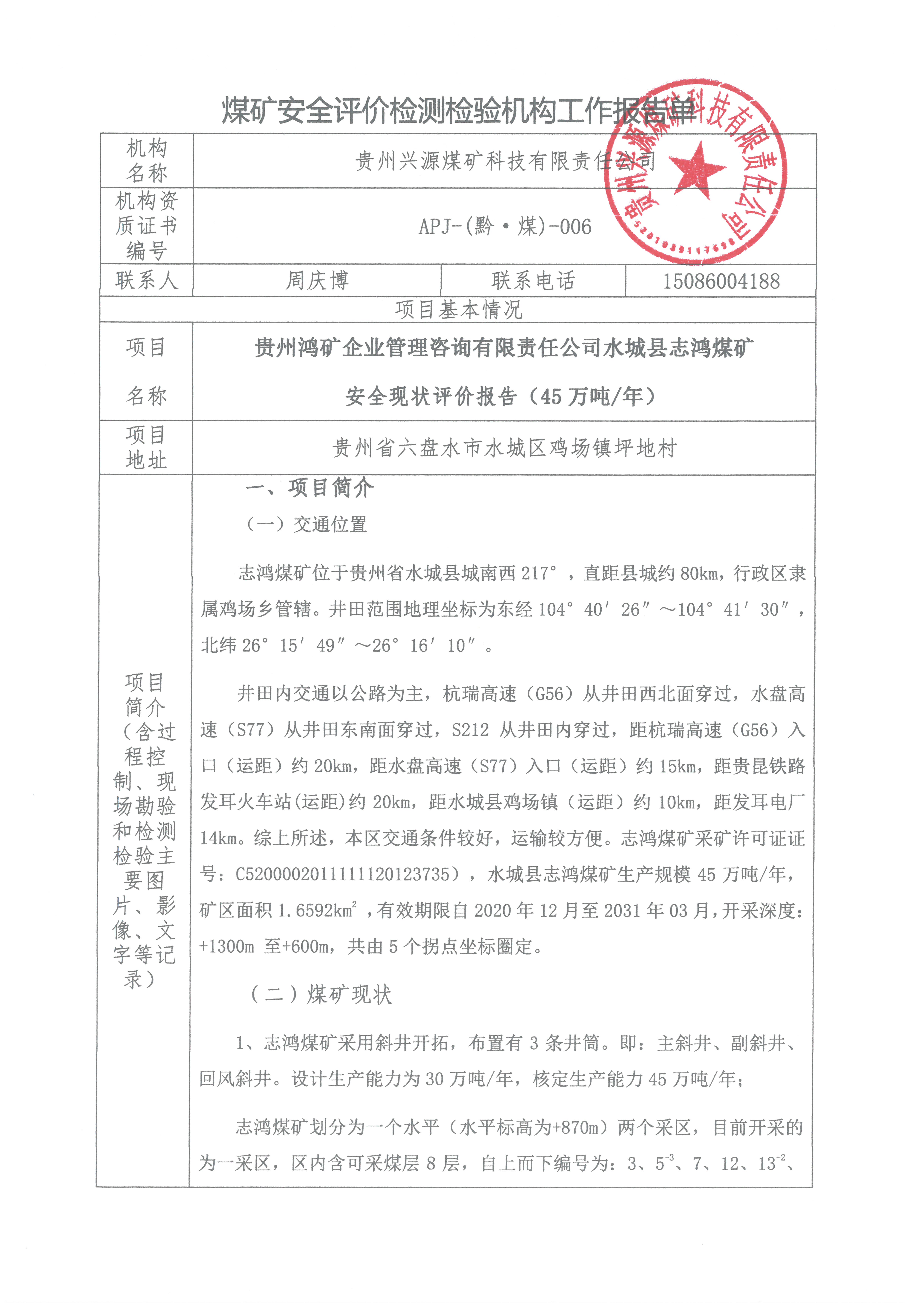煤礦安全評價檢測檢驗機構工作報告單[貴州鴻礦企業管理咨詢有限責任公司水城縣志鴻煤礦 安全現狀評價報告(45萬噸/年)]