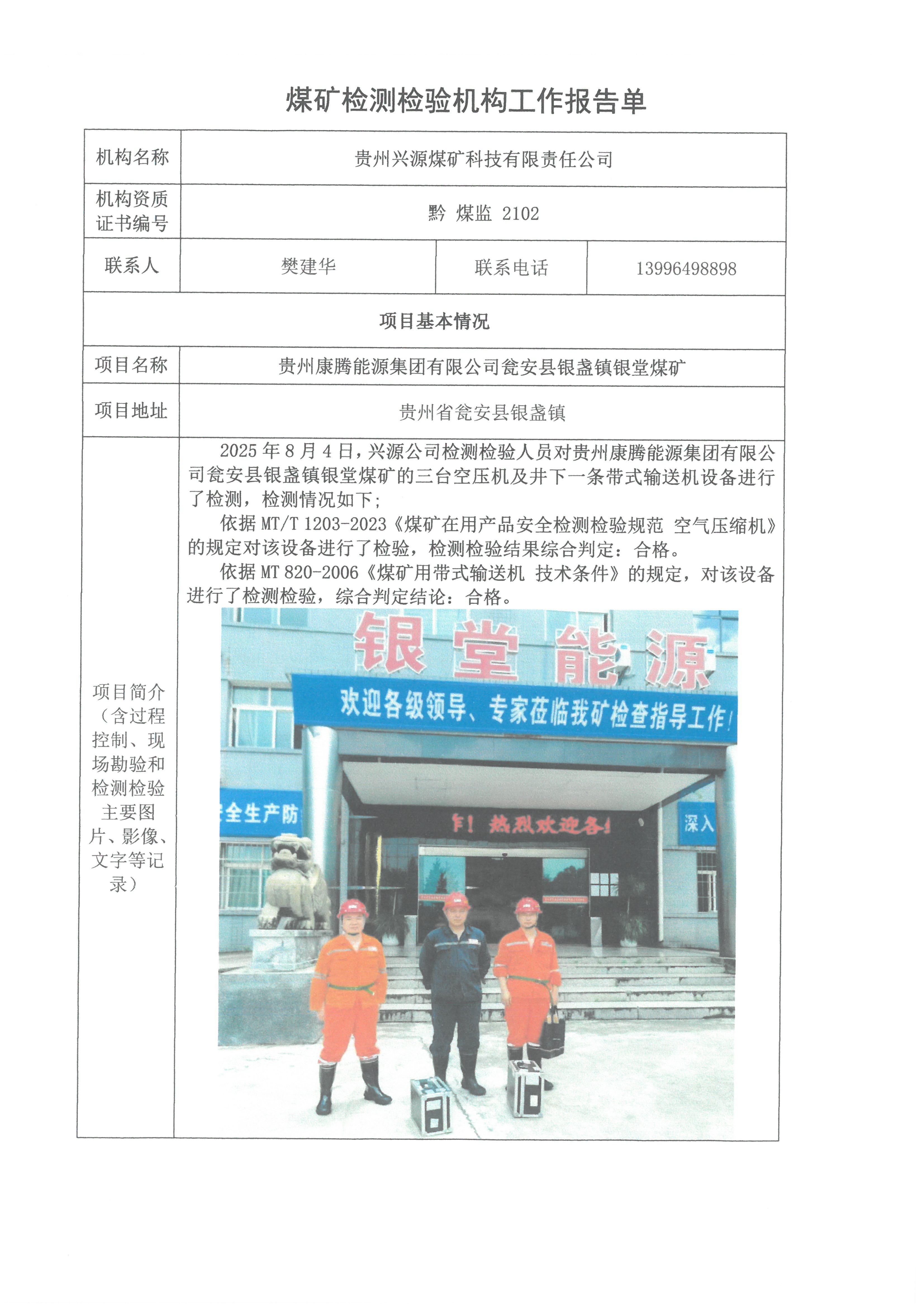 煤礦檢測檢驗機構工作報告單【貴州康騰能源集團有限公司甕安縣銀盞鎮銀堂煤礦】