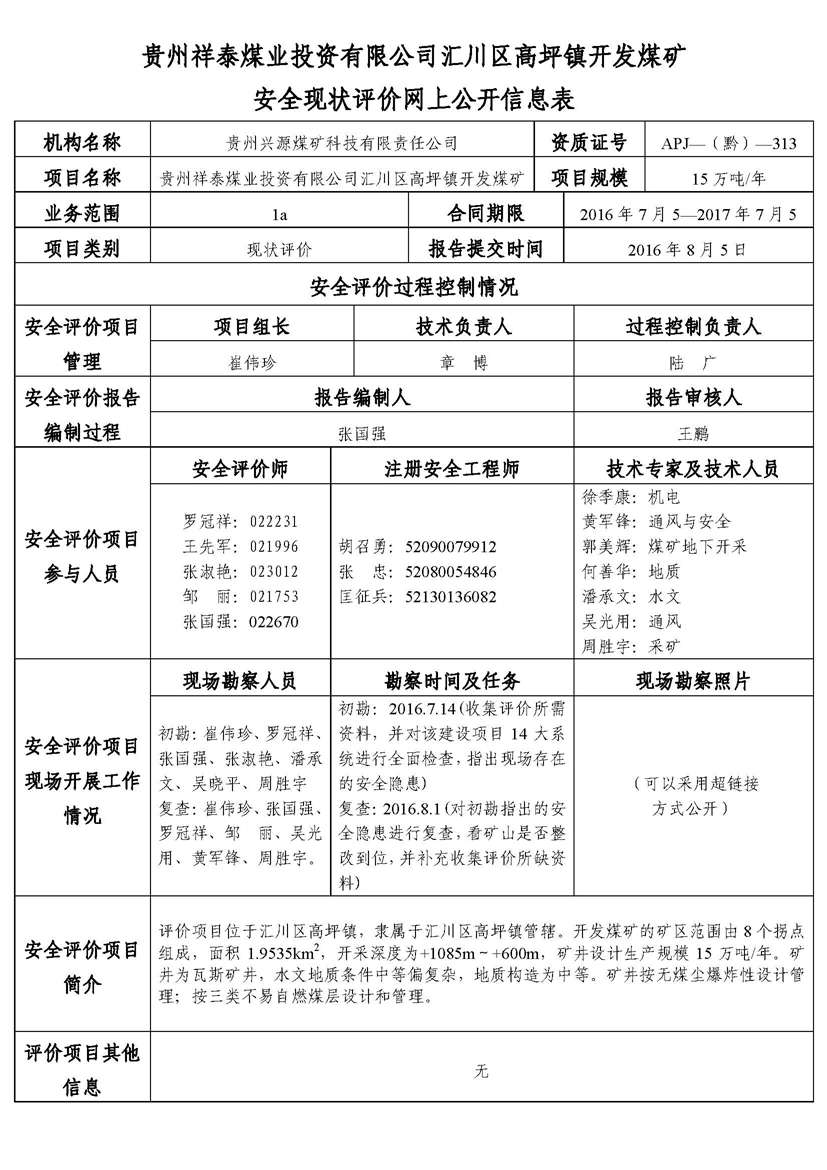 貴州祥泰煤業投資有限公司匯川區高坪鎮開發煤礦安全現狀評價網上公開信息表