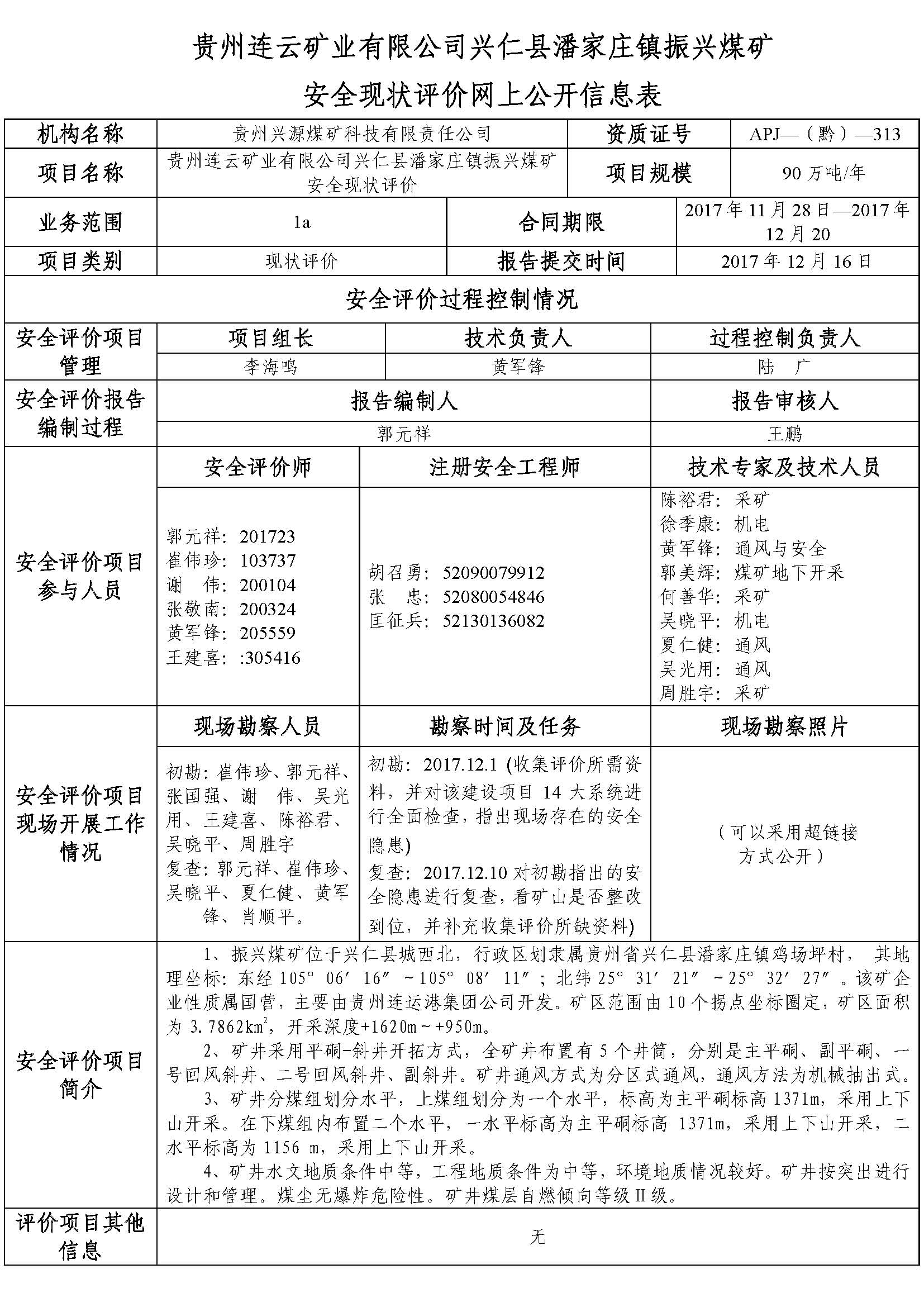 貴州連云礦業(yè)有限公司興仁縣潘家莊鎮(zhèn)振興煤礦安全現(xiàn)狀評價(jià)網(wǎng)上公開信息表
