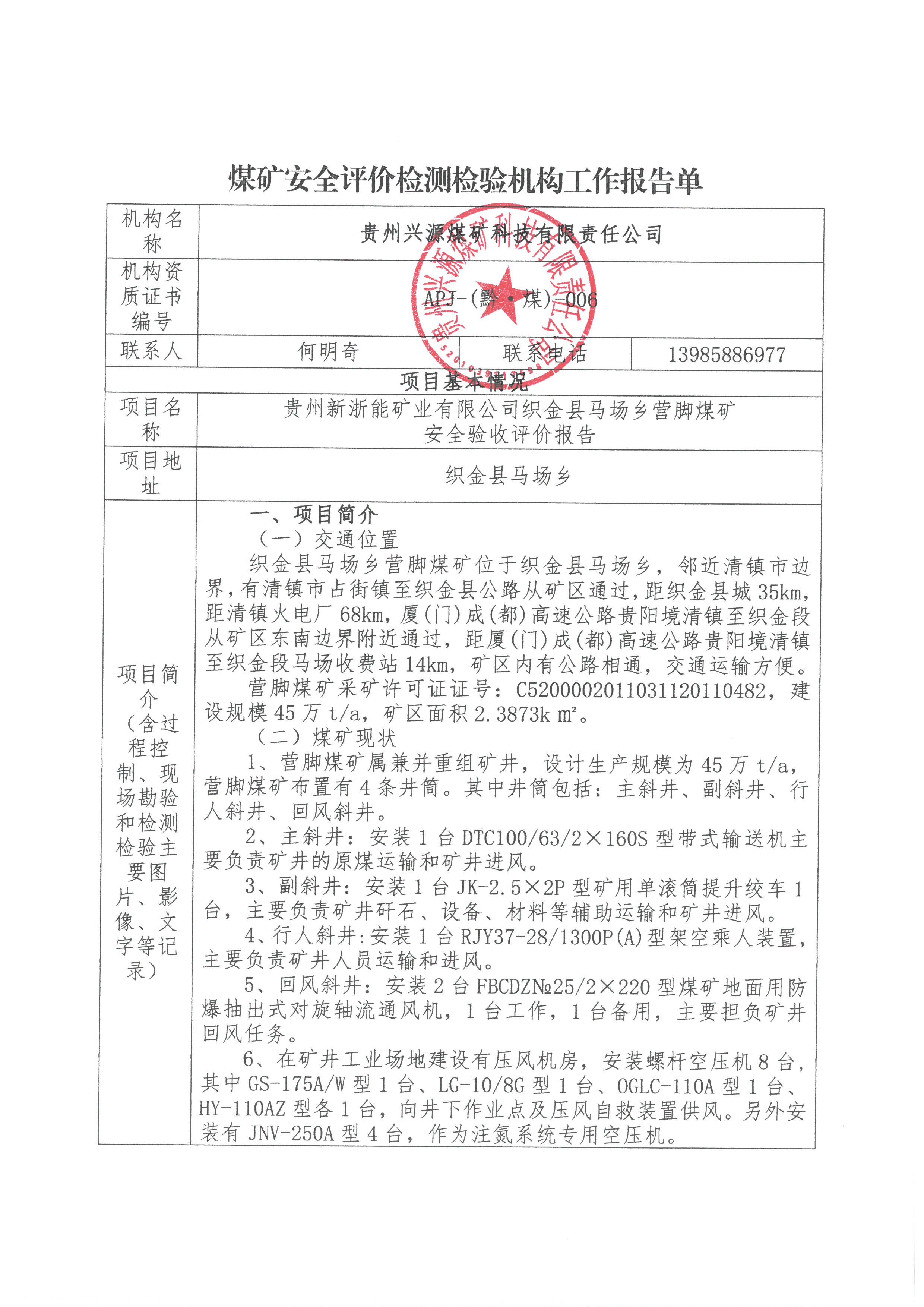 煤礦安全評價檢測檢驗機構工作報告單【貴州新浙能礦業(yè)有限公司織金縣馬場鄉(xiāng)營腳煤礦安全驗收評價報告】