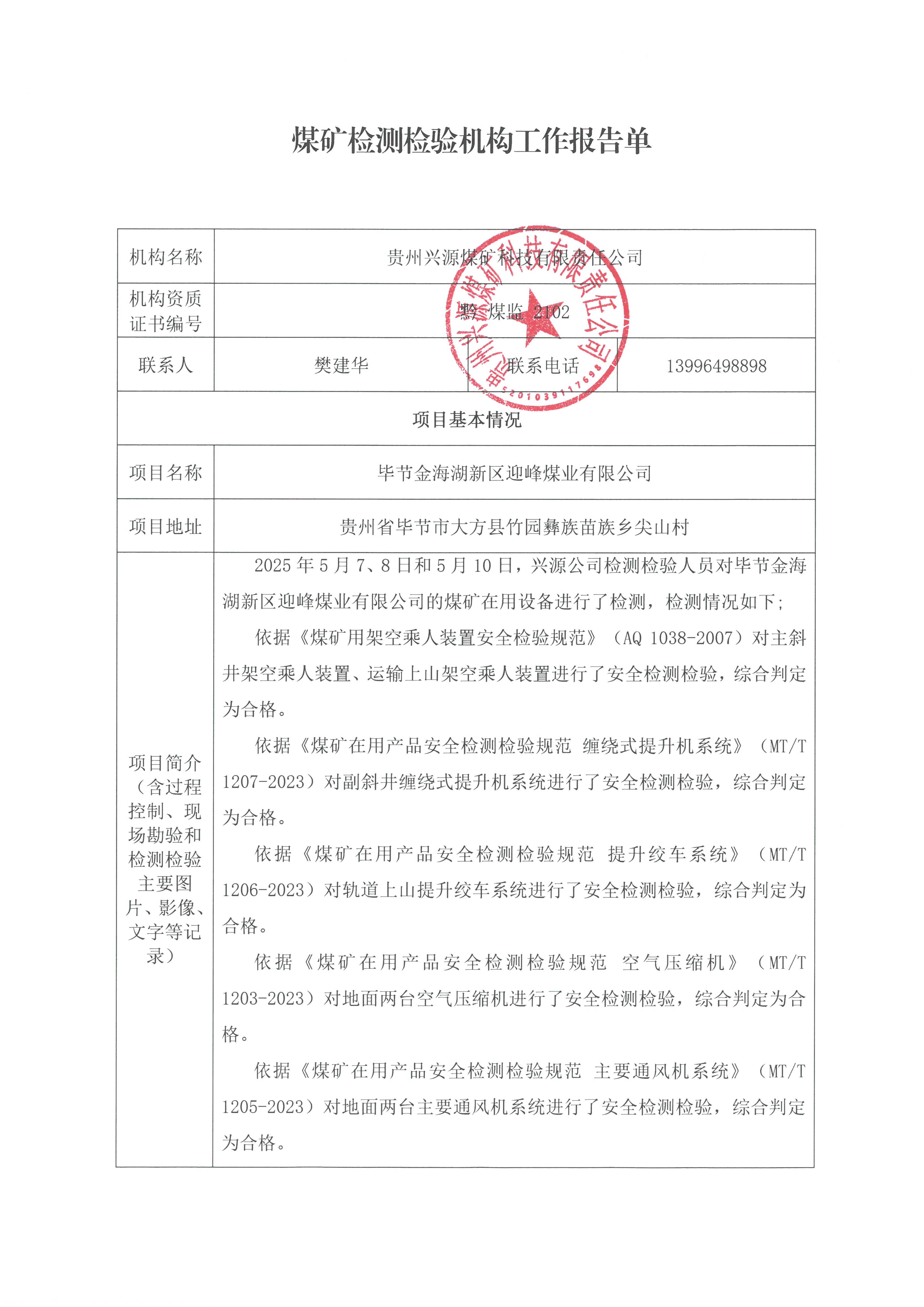煤礦檢測檢驗機構工作報告單【畢節金海湖新區迎峰煤業有限公司】