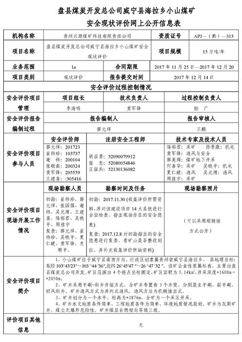 盤縣煤炭開發總公司威寧縣海拉鄉小山煤礦安全現狀評價網上公開信息表